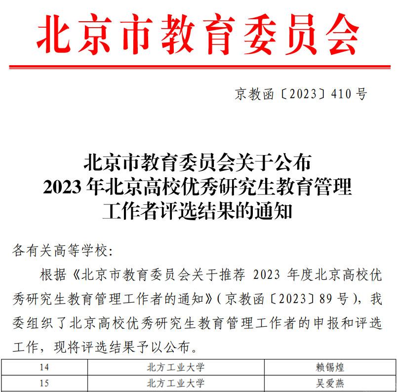 近日,北京市教育委員會公布了2023年北京高校優(yōu)秀研究生教育管理工作者評選結(jié)果,我校兩名研究生教育管理工作人員獲評“北京高校優(yōu)秀研究生教育管理工作者”稱號。