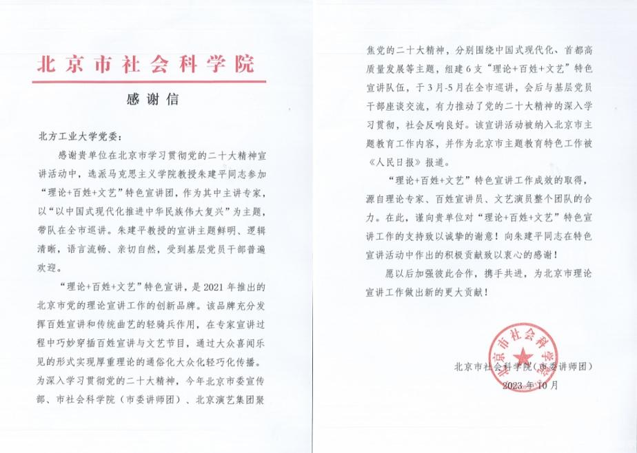 近日,北京市社會科學院(市委講師團)給我校發來感謝信,感謝我校對北京市學習貫徹黨的二十大精神宣講活動的大力支持,對我校馬克思主義學院朱建平教授在“理論+百姓+文藝”特色宣講中表現給予充分肯定。