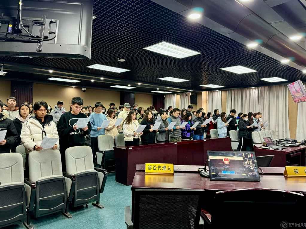 文法學院還發揮專業優勢,組織百余名學生線上線下開展憲法學習活動。在瀚學樓710學術中心及610模擬法庭,兩個會場同步組織學生集中線上收看第十個國家憲法日教育系統“憲法晨讀”活動,并分別在線下組織開展憲法誦讀。