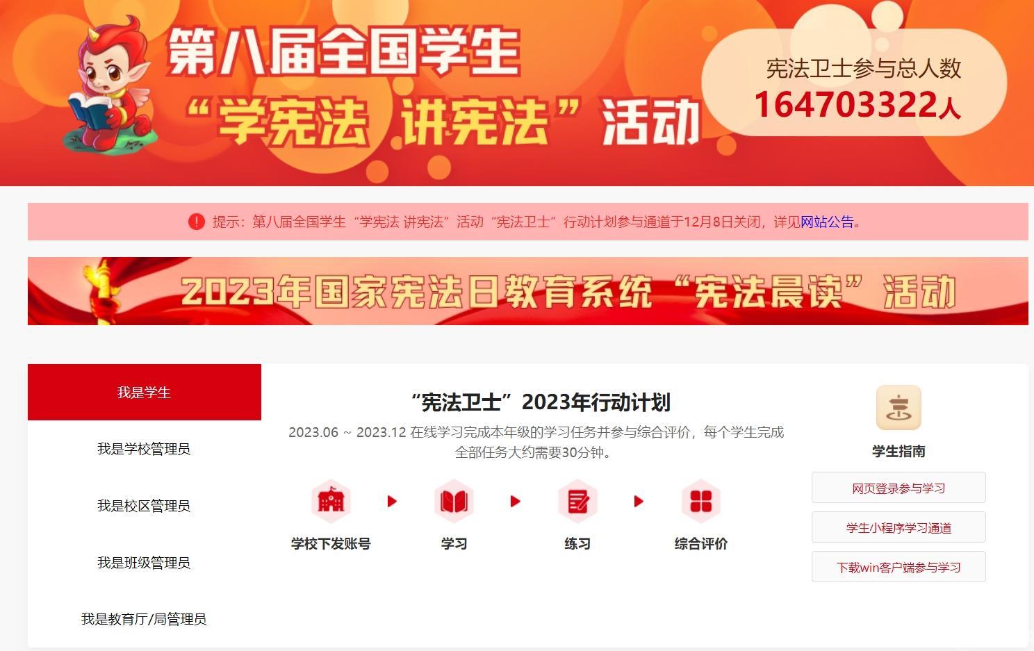 學校師生牢固樹立憲法意識,積極參與由教育部全國青少年普法網組織開展的第八屆全國學生“學憲法 講憲法”活動,共計9842人參與了學習活動,通過線上學習的方式樹牢憲法意識,自覺養成尊法學法守法用法的良好習慣。