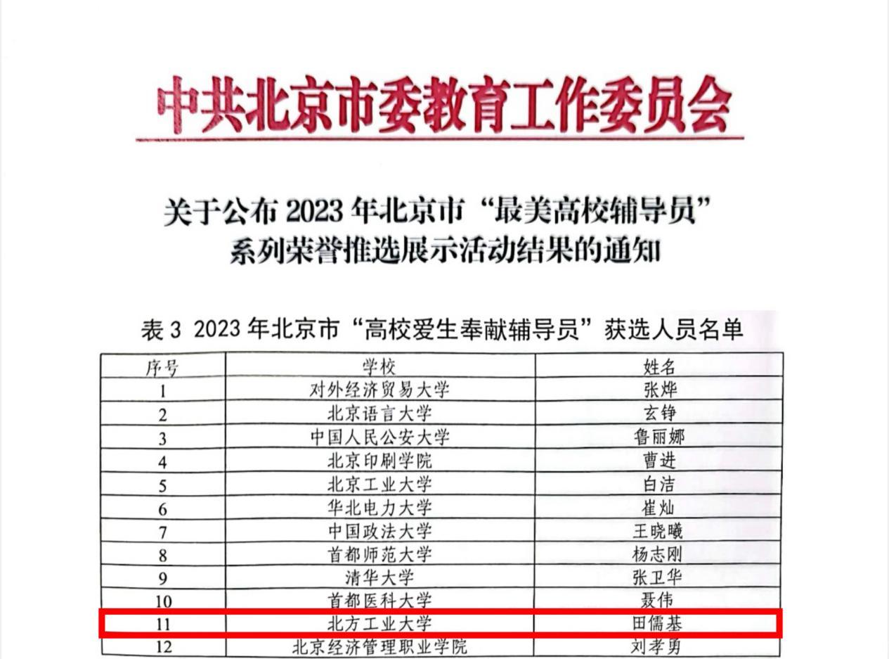 近日,北京市委教育工委公布北京市“最美高校輔導(dǎo)員”系列榮譽(yù)推選結(jié)果和“新時(shí)代北京高校思想政治工作創(chuàng)新示范項(xiàng)目”遴選名單。我校電氣與控制工程學(xué)院輔導(dǎo)員田儒基獲評(píng)2023年北京市“高校愛生奉獻(xiàn)輔導(dǎo)員”榮譽(yù)稱號(hào),“繡花”思政工作室入選“北京高校思政工作創(chuàng)新示范工作室”,《“紐扣課堂”打造宿舍思政育人新模式》《融合式心理干預(yù)助學(xué)生化“無(wú)望”為“希望”》案例入選“北京高校思政工作創(chuàng)新示范案例”。