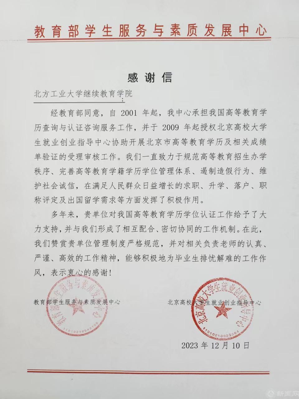 近日,我校繼續教育學院收到教育部學生服務與素質發展中心與北京高校大學生就業創業指導中心聯合發來的感謝信。信中對我校繼續教育學院在學歷學位認證方面的工作給予的充分肯定,對學院管理制度嚴格規范、負責老師認真嚴謹高效的工作精神、為畢業生排憂解難的工作作風表示衷心感謝。