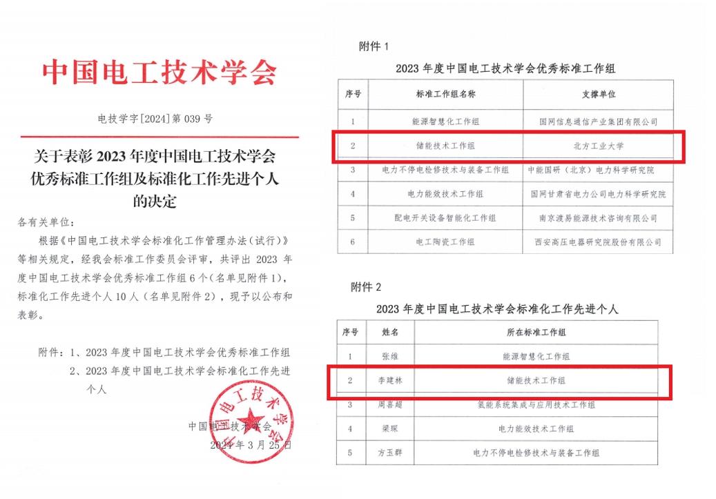 近日,中國電工技術學會發布《關于表彰2023年度中國電工技術學會優秀標準工作組及標準化工作先進個人的決定》,我校作為中國電工技術學會儲能技術標準專業分會支撐單位,獲得“2023年度中國電工技術學會優秀標準工作組”的榮譽稱號,李建林教授作為標委會秘書長,獲評“2023年度中國電工技術學會標準化工作先進個人”。