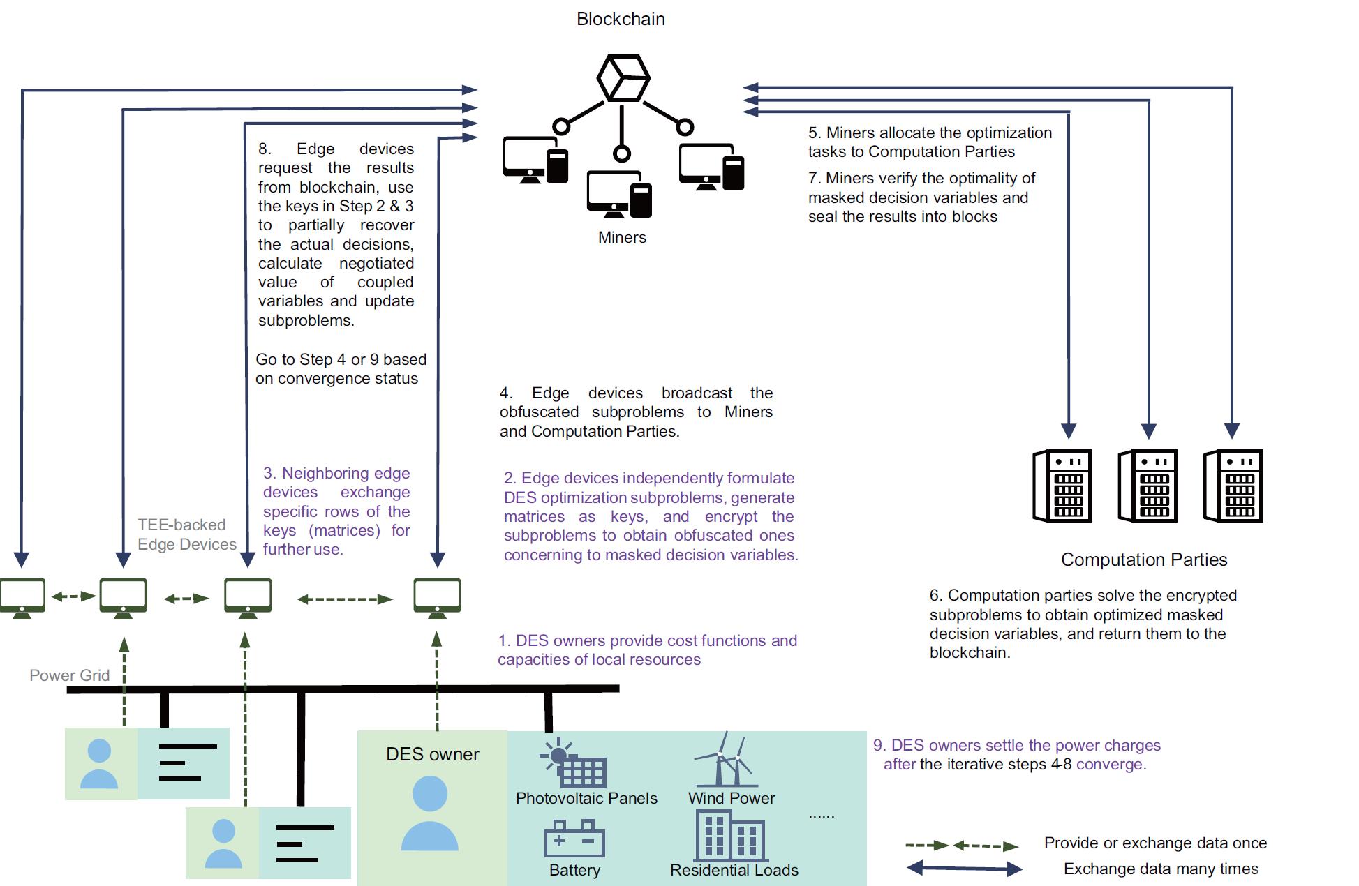 分布式能源系統利用終端用戶的分散式光伏、多能聯供和儲能等設備,提供輕便靈活的能源服務,是實現“雙碳”目標的重要手段。由于分布式能源系統具有多主體特征,集中化的統一調控模式常常因為操作權限問題或潛在的惡意操縱行為不被分布式用戶接受;現有的去中心化管理方案也因未能兼顧隱私保護和決策安全等需求,應用受到限制。