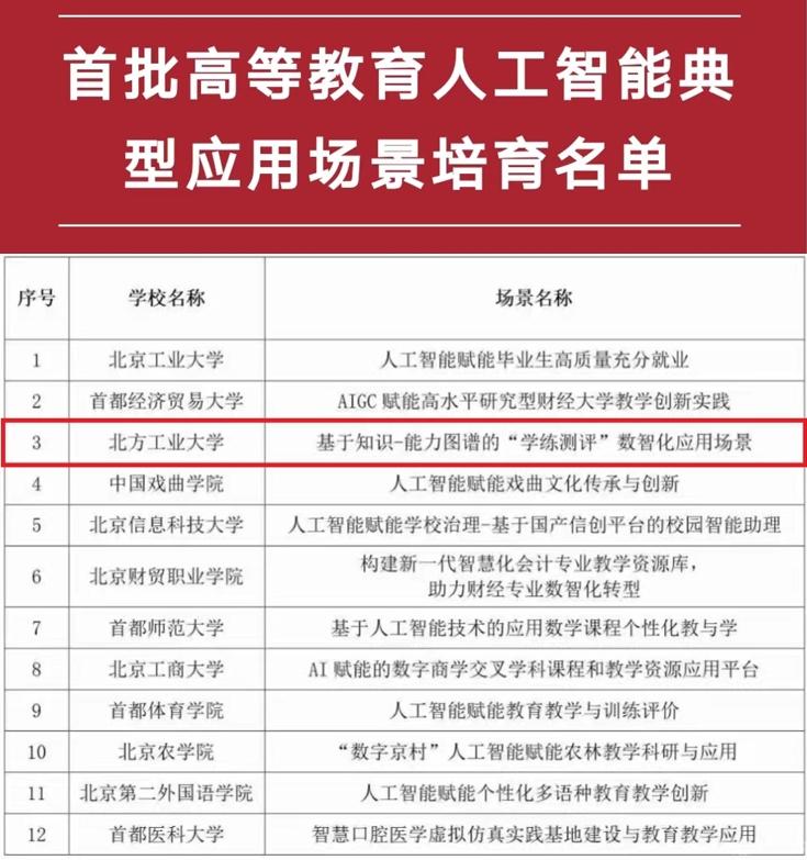 近日,北京市教委公布首批12個高等教育人工智能典型應用場景名單,我校申報的《基于知識-能力圖譜的“學練測評”數(shù)智化應用場景》入選。