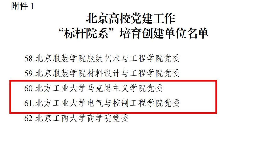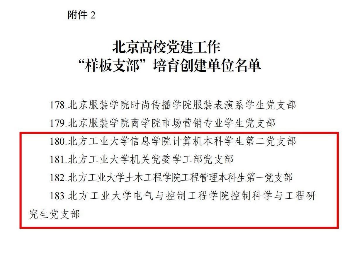 近日,北京市教育委員會公布了北京高校黨建工作 “標(biāo)桿院系”“樣板支部”“黨建引領(lǐng)實(shí)踐創(chuàng)新示范項目”培育創(chuàng)建遴選結(jié)果,我校電氣與控制工程學(xué)院黨委、馬克思主義學(xué)院黨委入選北京高校黨建工作“標(biāo)桿院系”培育創(chuàng)建單位;信息學(xué)院計算機(jī)本科學(xué)生第二黨支部、電氣與控制工程學(xué)院控制科學(xué)與工程研究生黨支部、土木工程學(xué)院工程管理本科生第一黨支部、機(jī)關(guān)黨委學(xué)工部黨支部入選北京高校黨建工作“樣板支部”培育創(chuàng)建單位。