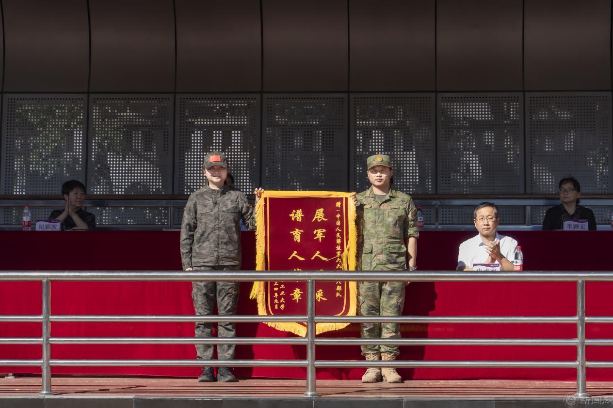 2024級學生軍訓團政委石卉向承訓部隊贈送錦旗。