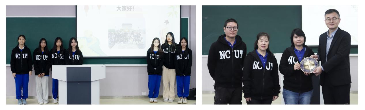 學生們分組進行了學習成果匯報,展示了自己在中文學習、文化體驗以及參觀交流中的心得感受,同時表達了對中國文化的熱愛與敬仰。帶隊教師王美佳代表清邁王子學校對我校的精心組織和周到安排表達了衷心的感謝,表示此次美好的經歷將激勵學生們繼續學習中文,并期待著再次與北方工大相聚。國際學院院長韓飛代表學校向研修團贈送校訓盤,并希望與泰國清邁王子學校有更深入的交流合作。