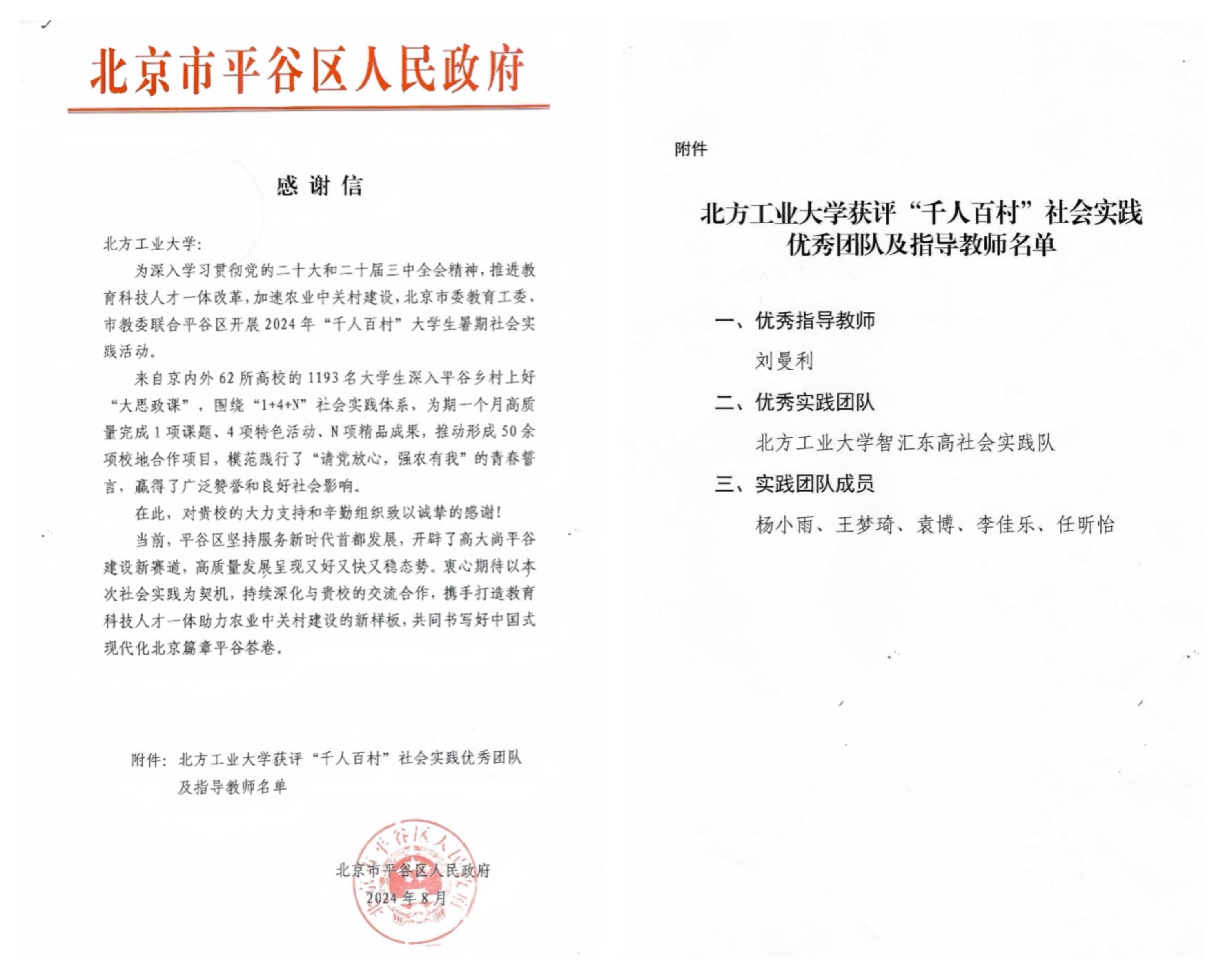 日前,我校文法學院智匯東高社會實踐團在首都高校2024年“千人百村”大學生社會實踐活動中獲評“優秀實踐團隊”,指導教師劉曼利獲評“優秀指導教師”。北京市平谷區人民政府、北京市平谷區東高村鎮大莊戶村村民委員會對實踐團致函感謝。