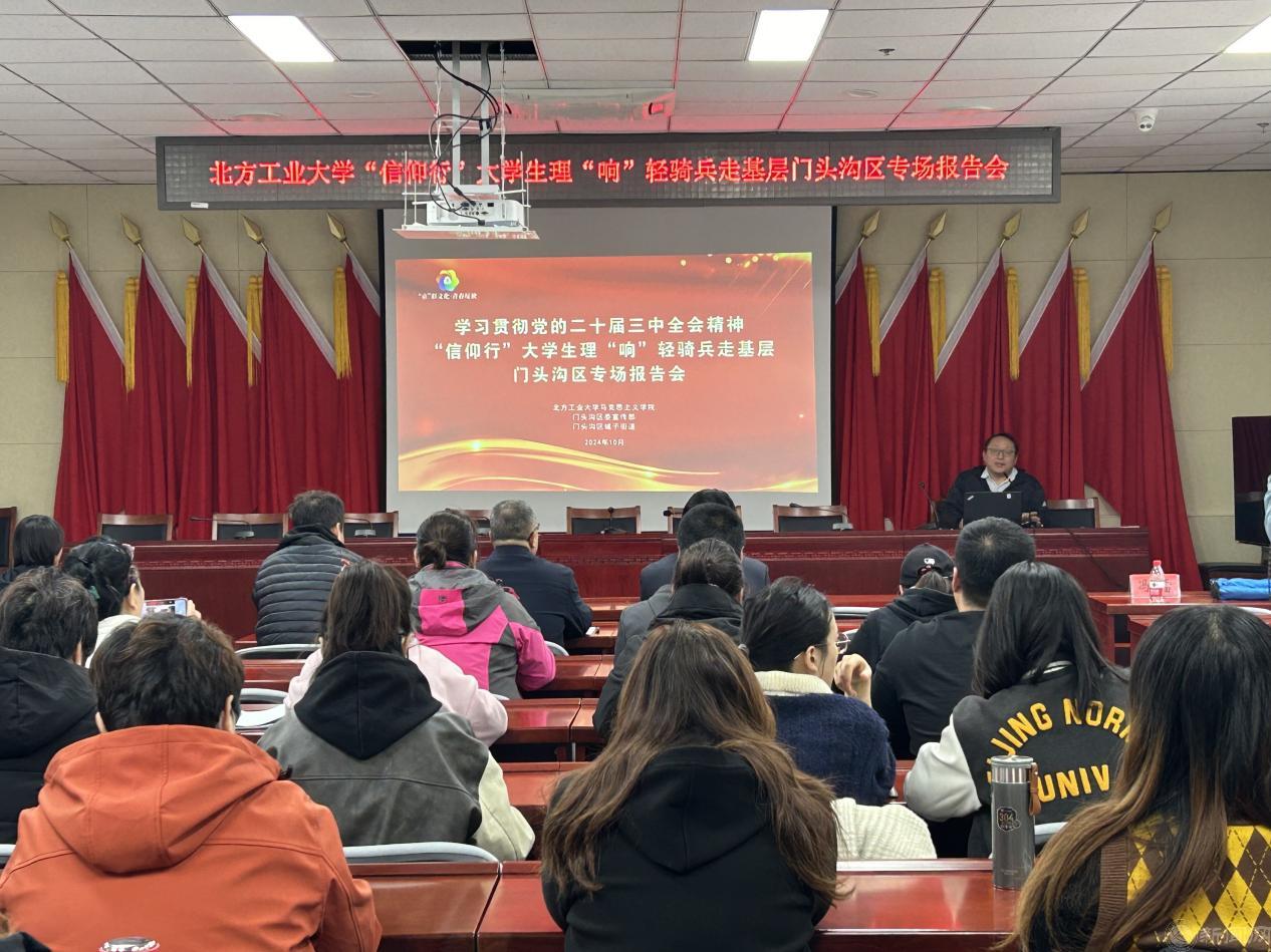 為推動(dòng)學(xué)習(xí)貫徹黨的二十屆三中全會(huì)精神走深走實(shí),讓黨的創(chuàng)新理論在基層落地生根,營造奮進(jìn)新征程的良好氛圍,10月30日,馬克思主義學(xué)院師生宣講團(tuán)赴門頭溝區(qū)城子街道、軍莊鎮(zhèn)開展大學(xué)生理“響”輕騎兵走基層活動(dòng),專題宣講黨的二十屆三中全會(huì)精神。百余名黨員代表、群眾代表參加宣講活動(dòng)。