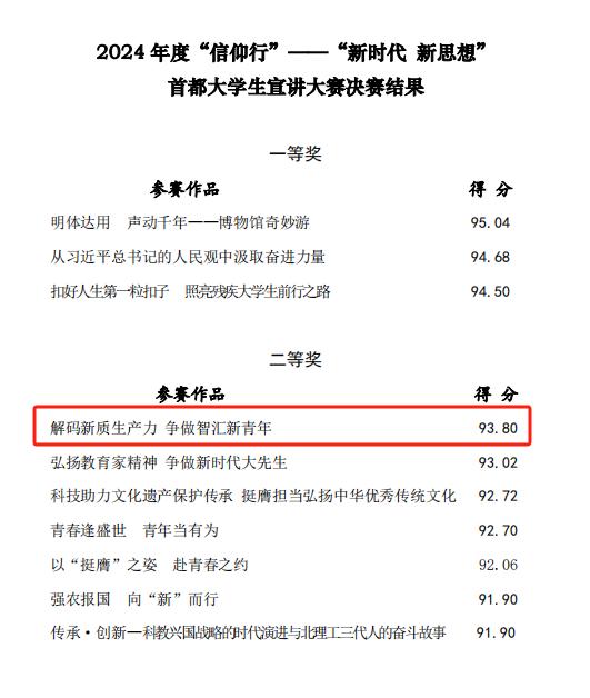 近日,北京市委宣傳部、北京市委教工委、北京市社科院等單位聯(lián)合舉辦“信仰行”——“新時代 新思想”首都大學生宣講大賽決賽。來自清華大學、中國人民大學等14所高校的19支學生代表隊參加比賽,圍繞以中國式現(xiàn)代化全面推進強國建設的主題進行宣傳展示。經(jīng)過激烈角逐,我校代表隊榮獲二等獎。