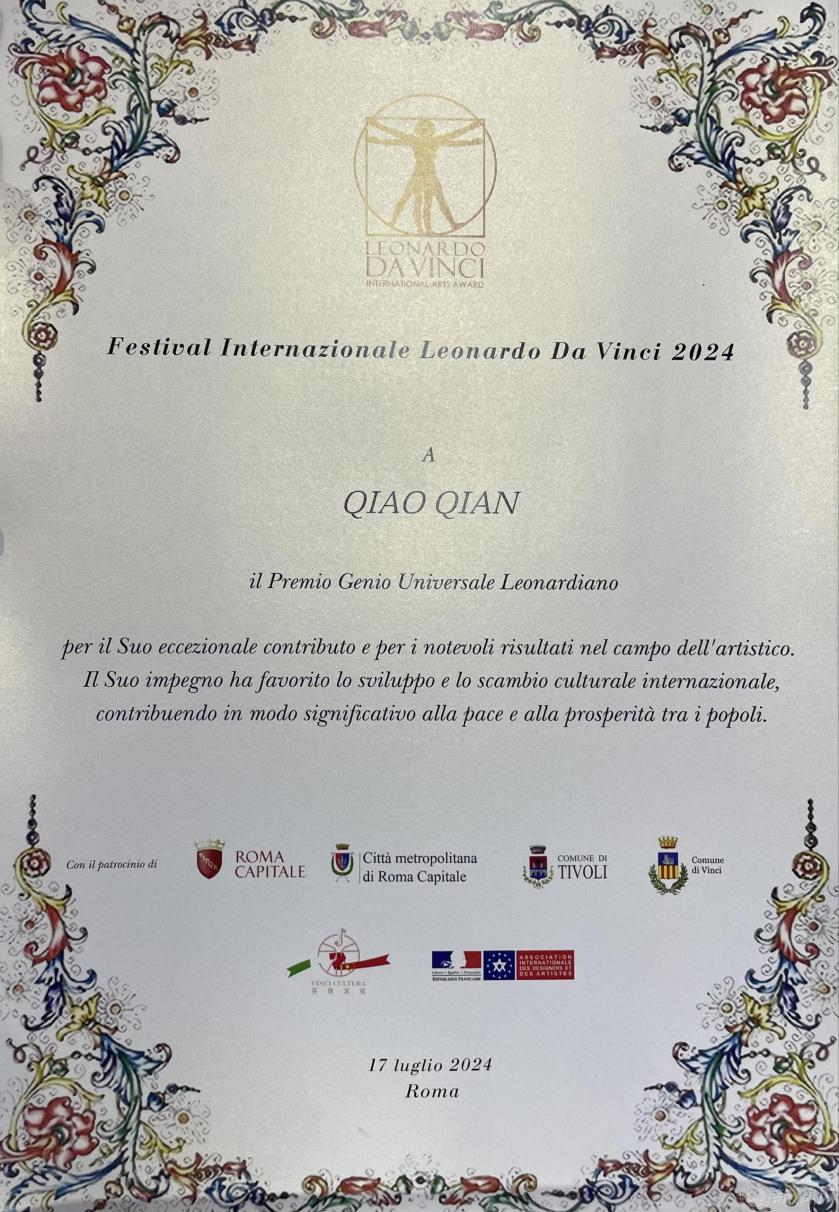 近日,2024達(dá)·芬奇藝術(shù)獎(jiǎng)?lì)C獎(jiǎng)典禮在羅馬市政廳揭幕。本次頒獎(jiǎng)典禮由意大利國(guó)會(huì)參議院議員Alessandro Battilocchio 先生、羅馬市文化旅游和時(shí)尚設(shè)計(jì)委員會(huì)主席Mariano Angelucci先生、意大利達(dá)·芬奇國(guó)際文化藝術(shù)交流協(xié)會(huì)會(huì)長(zhǎng)Wang tianqi先生、副會(huì)長(zhǎng)Alessandro Petrini 先生主持并頒獎(jiǎng)。我校喬遷老師獲評(píng)杰出藝術(shù)家獎(jiǎng),這一殊榮旨在表彰在藝術(shù)領(lǐng)域具有杰出成就的藝術(shù)家與研究者。