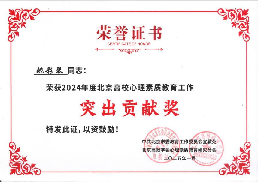 1月10日,北京市委教育工委宣教處、北京高教學會心理素質教育研究分會組織召開2024年北京高校心理健康教育工作年會。會上,我校榮獲集體“特色工作獎”和個人“突出貢獻獎”。