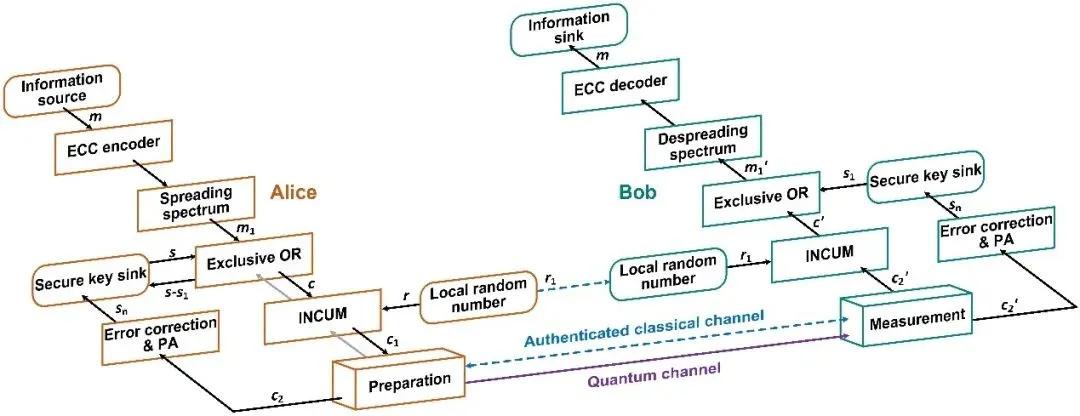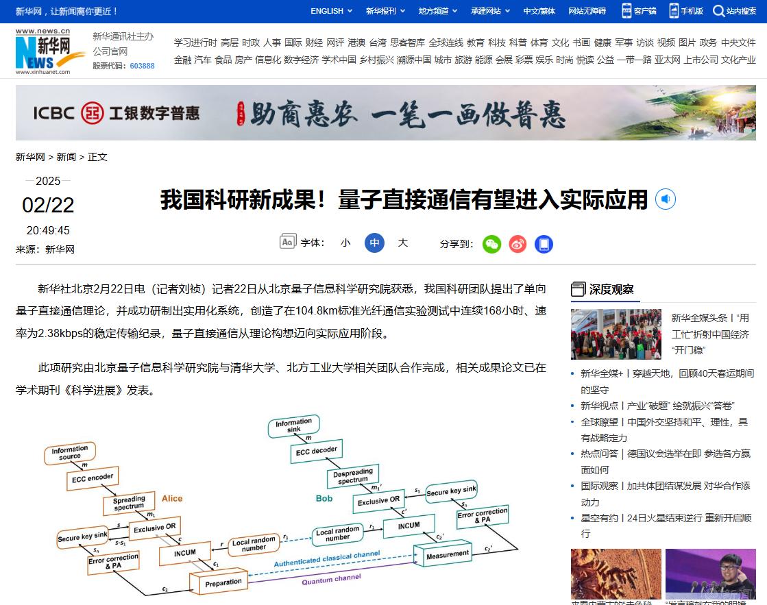 量子直接通信具有竊聽感知、阻止竊聽、兼容現(xiàn)有網絡、簡化管理流程以及隱蔽傳輸?shù)任宕筇匦裕瑸楸U闲畔鬏敯踩峁┝巳陆鉀Q方案。此前,國際上多個團隊曾提出的單向量子直接通信方案,僅在無損耗的理想條件下可行,在高損耗和高噪聲的現(xiàn)實環(huán)境中開展困難重重。此項研究中,研究團隊成功突破了高噪高損信道編碼、信道掩碼增容、高速量子態(tài)調制解調等系列關鍵技術,提出單向量子直接通信理論方法,利用同一組光量子態(tài)同時實現(xiàn)了信息的安全傳輸與密鑰協(xié)商,極大地提升了量子直接通信的性能,有望廣泛應用于政務、金融等對信息安全要求極高的應用領域,以及智慧韌性城市治理涉及的能源電力傳輸、綜合能源“源-網-荷-儲”系統(tǒng)、智慧交通、無人機低空通信等對通信網絡安全和算力提升要求高的應用場景,切實增強通信安全性。