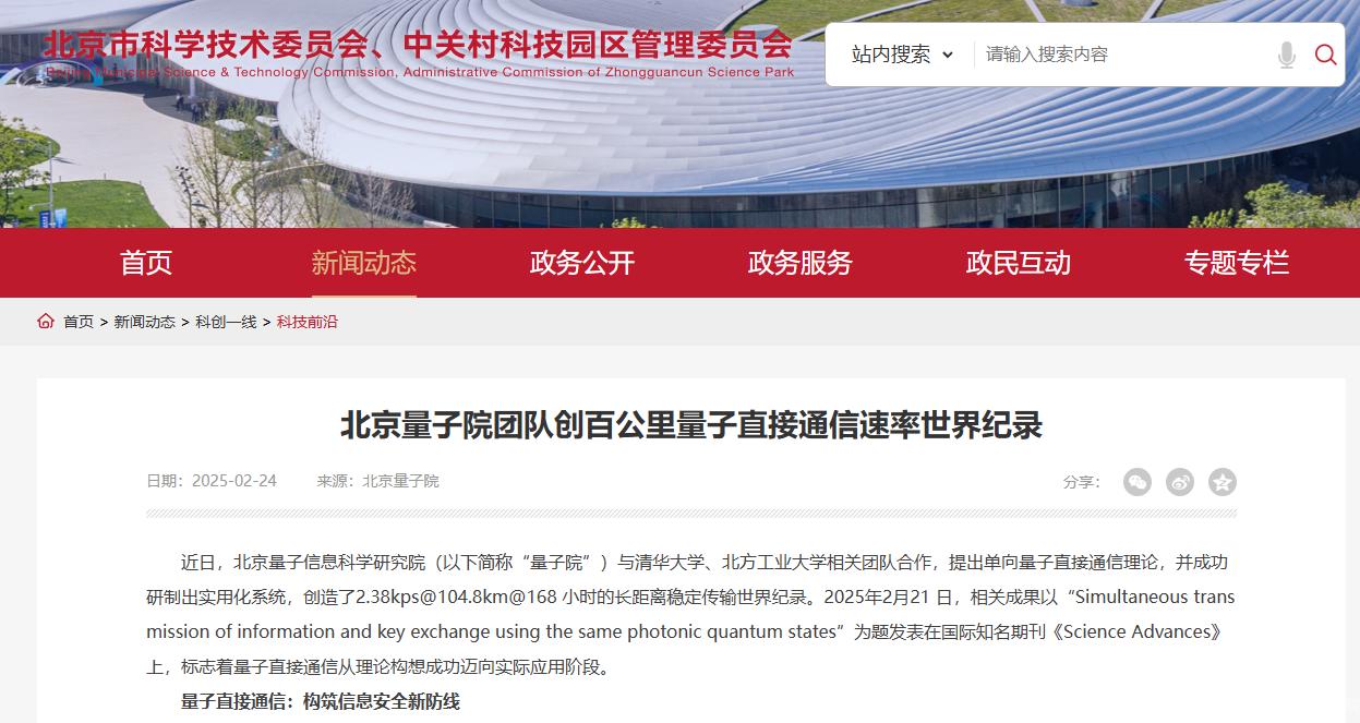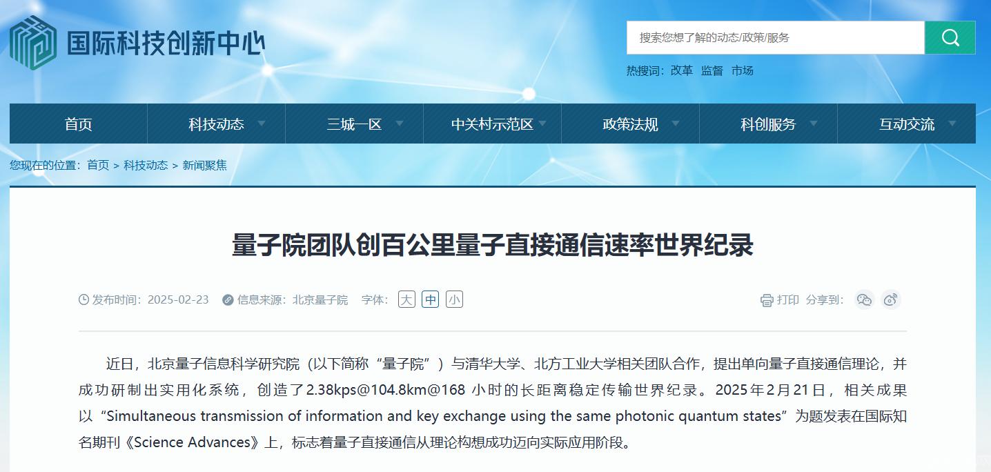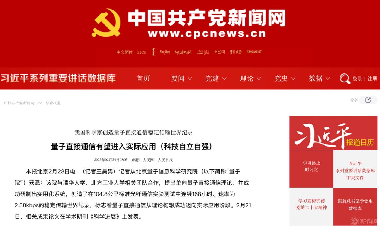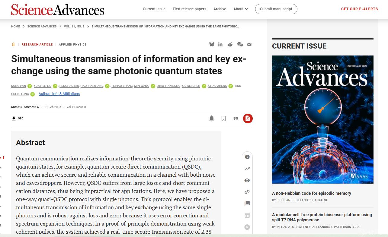 近日,我校儲能學院鄭超教授領銜的儲能量子直接通信與計算團隊作為參研單位,與北京量子信息科學研究院和清華大學相關團隊合作,提出單向量子直接通信理論,成功研制出實用化系統(tǒng),創(chuàng)造了在104.8公里標準光纖通信實驗測試中連續(xù)168小時、速率為2.38kbps的穩(wěn)定傳輸世界紀錄。相關成果于2025年2月21日在國際知名學術期刊《Science Advances》(《科學進展》)上發(fā)表,這標志著量子直接通信從理論構想成功邁向實際應用階段。