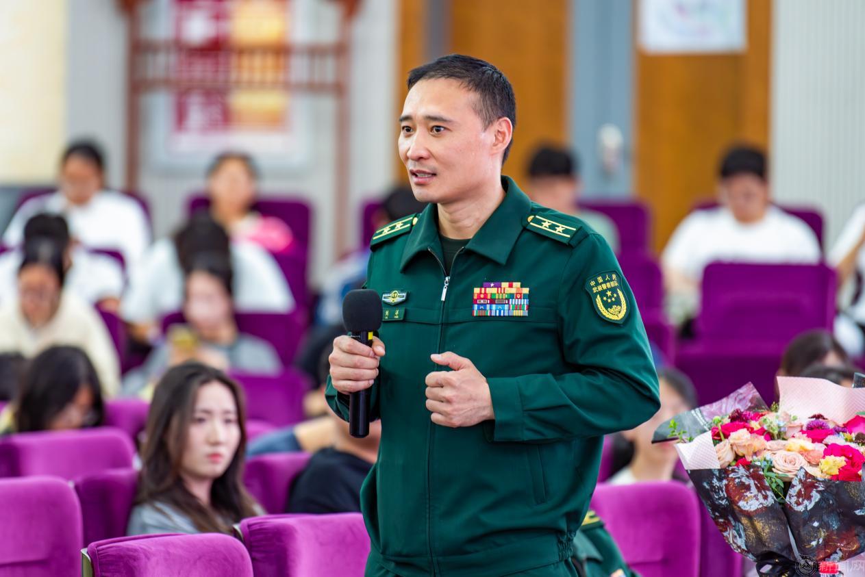 劉洋同志的報告語言樸實、情感真摯,讓在場師生深切感受到了新時代中國青年“清澈的愛,只為中國”的赤子之心,現場不時響起熱烈掌聲。在互動交流環節,同學們踴躍提問,與劉洋進行了深入交流,為表示對“特戰尖兵”的歡迎和敬意,學生代表向劉洋敬獻了鮮花。