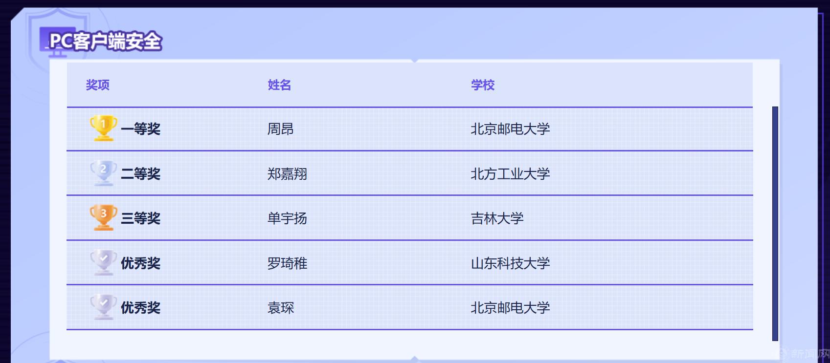 騰訊游戲安全技術競賽由企業騰訊科技有限公司主辦,是面向高校學生打造的國內首個專注于“游戲安全”領域的技術賽事。本次大賽吸引了來自全國各高校的500多名參賽選手,決賽有包括北京郵電大學、中國科學院大學、哈爾濱工業大學、信息工程大學在內的25所高校。鄭嘉翔同學經過初賽與復賽總計6天、共144小時的高強度比賽,展示出扎實的理論功底和突出的實踐能力,受到評委的認可,最終取得良好成績。