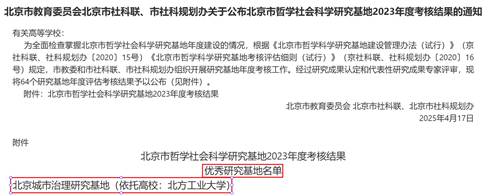 近日,北京市教委、市社科聯和規劃辦公布了北京市哲學社會科學研究基地2023年度考核結果,我校北京城市治理研究基地再次獲評優秀,這是我校研究基地連續兩年獲評優秀。本年度共有64個北京市哲學社會科學研究基地參與考核,其中優秀27個,合格34個,不合格3個。