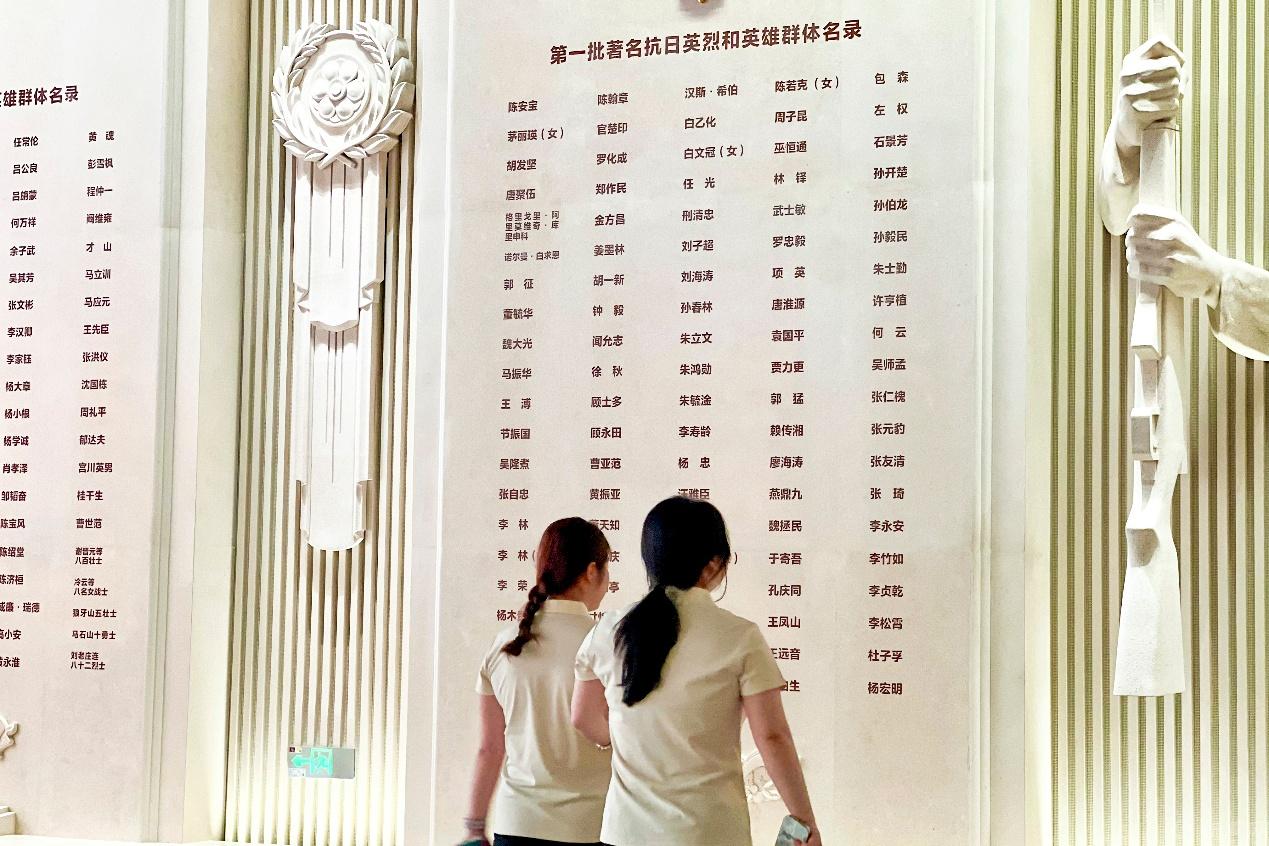 徐徐步入莊嚴肅穆的展廳,師生們在一件件珍貴的文獻、照片、文物等史料面前駐足學習,感悟中華兒女共赴國難、浴血奮戰的烽火歲月。場景式的陳列讓一段段艱苦卓絕的抗戰歷史鮮活地呈現在師生面前,師生們學習沉思、討論交流,通過珍貴歷史影像和文物實物,在光影變換中與抗戰人物對話,沉浸式學習14年抗戰的浴血榮光。在抗戰巨型照片墻前,在楊靖宇、趙尚志、左權、彭雪楓、佟麟閣、趙登禹、張自忠等殉國將領的事跡展陳前,在八路軍“狼牙山五壯士”、新四軍“劉老莊連”、東北抗聯八位女戰士等眾多英雄群體展覽前,師生們久久駐足、深情凝望,學習抗日將士的英勇事跡和豐功偉績。