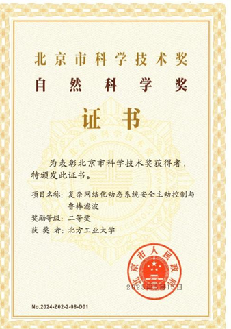由我校作為第一完成單位,龐中華教授為第一完成人的項目“復雜網絡化動態系統安全主動控制與魯棒濾波”,獲得“自然科學獎”二等獎。姚海波教授參與完成的項目“小凈距超大跨隧道建造關鍵技術及應用”,獲得“科學技術進步獎”二等獎。胡長斌教授參與完成的項目“保障超大城市用電安全的需求側資源靈活調節關鍵技術及工程應用”,獲得“科學技術進步獎”二等獎。