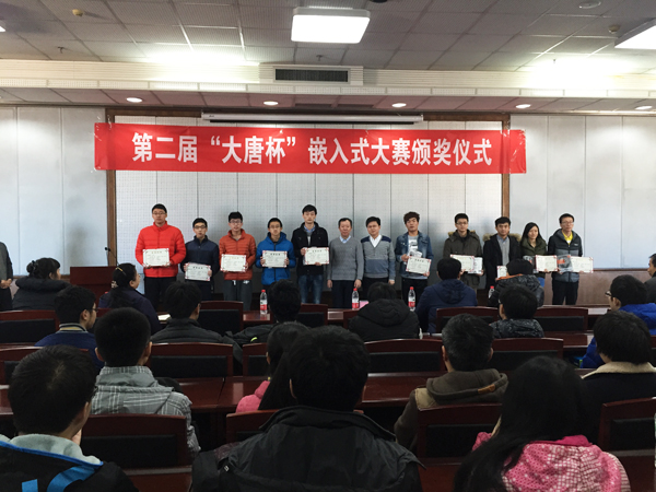 12月16日,北方工業大學第二屆“大唐杯”嵌入式設計與開發競賽頒獎儀式在四教15層報告廳舉行。教務處處長王景中、電信學院副院長曹淑琴、黨委副書記王偉賓、通信系主任白文樂、大賽指導老師劉紅、大唐移動通信學院副院長楊勝、產品總監張磊、產品經理李楊等出席活動并為獲獎學生頒獎。會議由王偉賓主持。
