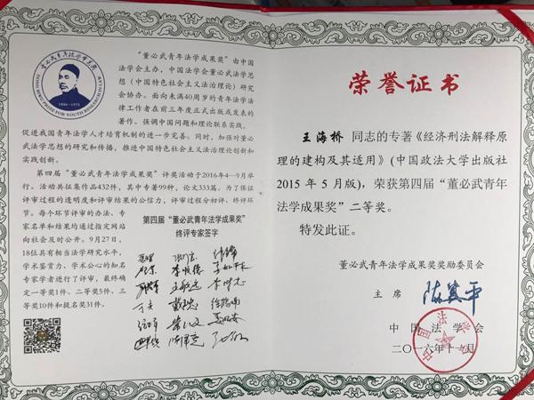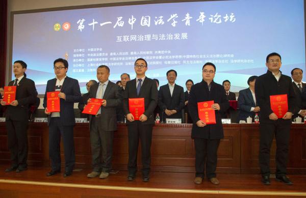 11月18日,以“互聯網治理與法治發展”為主題的第十一屆中國法學青年論壇在國家檢察官學院舉行。中國法學會會長王樂泉,最高人民檢察院黨組書記、檢察長曹建明出席論壇開幕式并講話。中國法學會黨組書記、常務副會長陳冀平主持開幕式。開幕式上舉行了第四屆“董必武青年法學成果獎”的頒獎儀式。我校王海橋副教授榮獲二等獎,應邀出席青年法學論壇開幕式并作為獲獎代表接受最高人民檢察院黨組書記、檢察長曹建明頒獎。
