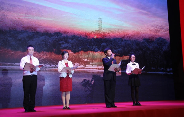上午10時,慶祝大會正式開始。校黨委書記謝輝主持大會并致開幕詞,與會人員全體起立奏唱國歌。