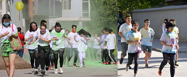 隨后,鄭校長(zhǎng)鳴槍發(fā)令,500多名學(xué)生開(kāi)始了環(huán)繞校園一周的慢跑。為了增加活動(dòng)的趣味性和參與熱情,主辦方設(shè)置了4個(gè)彩色粉末撒放點(diǎn),分別以黃、藍(lán)、綠、紅四種顏色的粉末撒到跑步者衣服上。同學(xué)們一邊奔跑,一邊享受運(yùn)動(dòng)和彩色帶來(lái)的歡樂(lè)。
