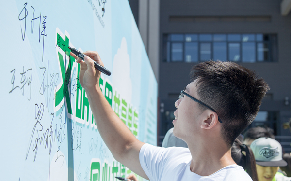 最后,參加活動(dòng)的師生們?cè)诒尘鞍迳虾灻允境兄Z文明使用共享單車、共建美麗校園的決心。