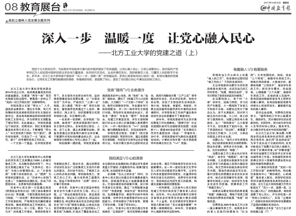 從計算機學院黨委“黨的一切工作到支部”的鮮明導向,到后勤飲食服務中心“胃的滿足,心的滿意”服務育人路徑,再到學校班級導師及輔導員群體各具特色的育人實踐,北方工業大學的黨建工作充分彰顯出了“深入一步,溫暖一度,讓黨心融入民心”的黨建品質,有效地凝聚了黨心民心,并為學校進一步“用黨心引領民心”,實現“立德樹人”的根本任務和學校科學發展提供了堅強的保障和充沛動力。