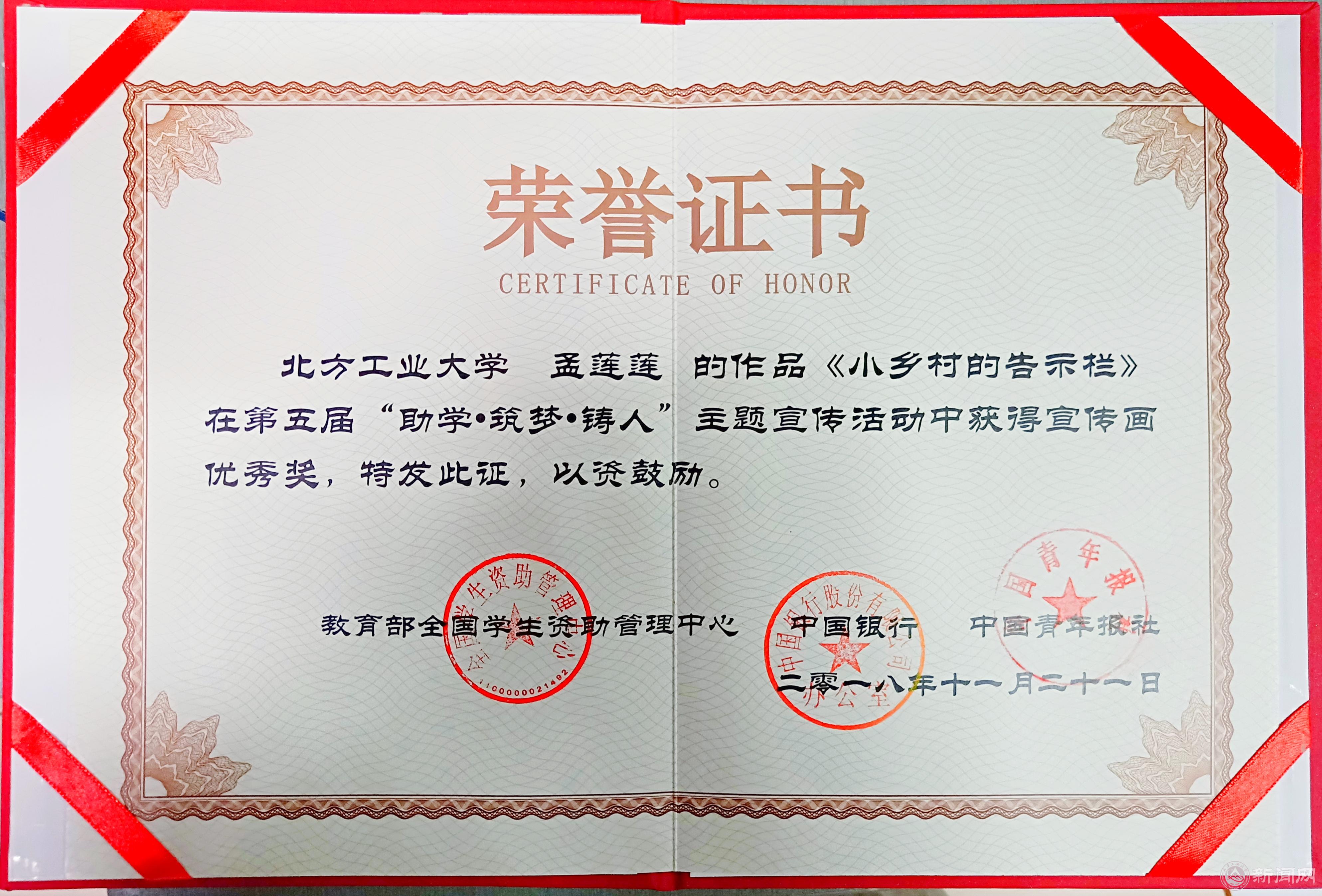 11月21日,第五屆“助學(xué)?筑夢(mèng)?鑄人”主題宣傳活動(dòng)總結(jié)大會(huì)在中國(guó)農(nóng)業(yè)大學(xué)東校區(qū)舉行,我校建筑與藝術(shù)學(xué)院視傳17-2班孟蓮蓮?fù)瑢W(xué)的作品“小鄉(xiāng)村的告示欄”榮獲本次活動(dòng)宣傳畫(huà)優(yōu)秀獎(jiǎng)。
