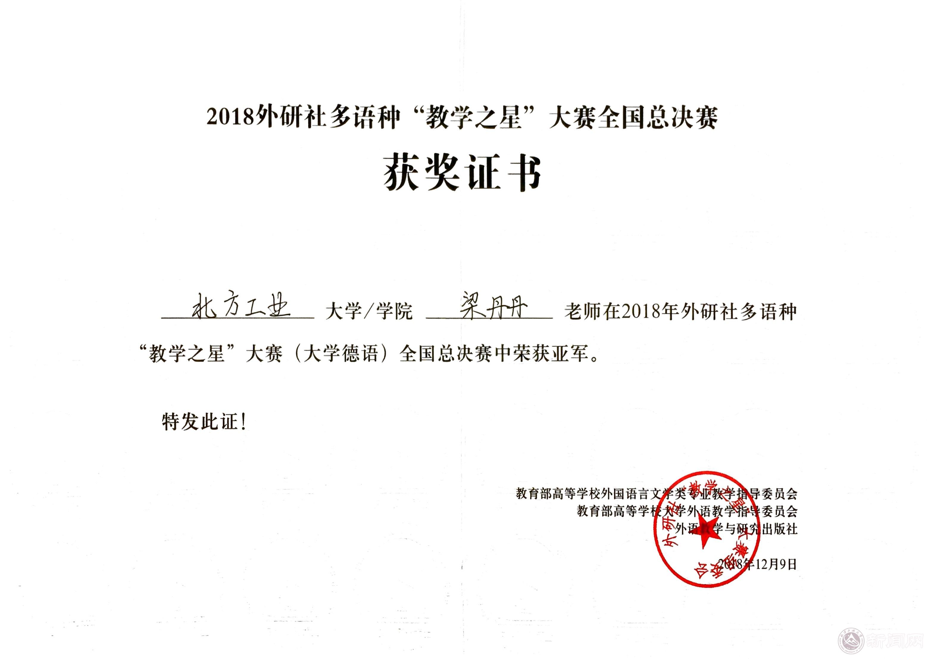 12月9日,由教育部高等學校外國語言文學類專業教學指導委員會、教育部高等學校大學外語教學指導委員會和外語教學與研究出版社共同舉辦的外研社杯多語種“教學之星”大賽全國總決賽落下帷幕,我校文法學院英語系梁丹丹老師獲得大學德語組亞軍。