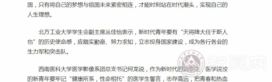 習(xí)近平總書記在紀(jì)念五四運(yùn)動(dòng)100周年大會(huì)的重要講話發(fā)表后,在社會(huì)各界引發(fā)強(qiáng)烈反響,更在我校掀起學(xué)習(xí)熱潮。日前,師生們紛紛通過人民網(wǎng)、北京電視臺(tái)等媒體表達(dá)強(qiáng)烈意愿,要牢記總書記囑托,練就過硬本領(lǐng),錘煉品德修為,做德才兼?zhèn)?、知行合一的新時(shí)代中國(guó)青年,在實(shí)現(xiàn)中華民族偉大復(fù)興之路上,書寫無悔青春的奮斗篇章。