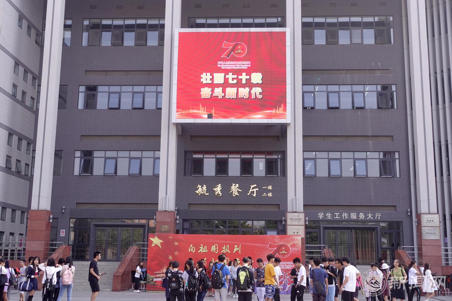 毓秀廣場(chǎng),大屏幕上鮮明的國(guó)慶主題十分醒目。
