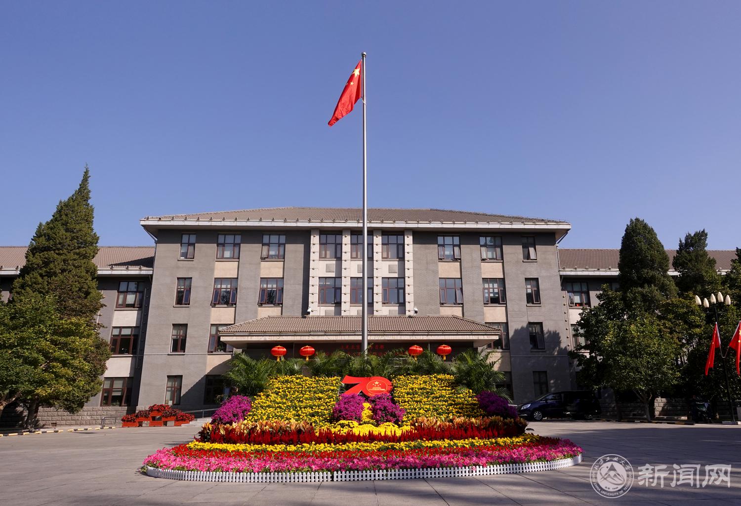敦品樓前,鮮艷的五星紅旗迎風(fēng)飄揚(yáng),國(guó)慶花壇里美麗的鮮花爭(zhēng)相斗艷。