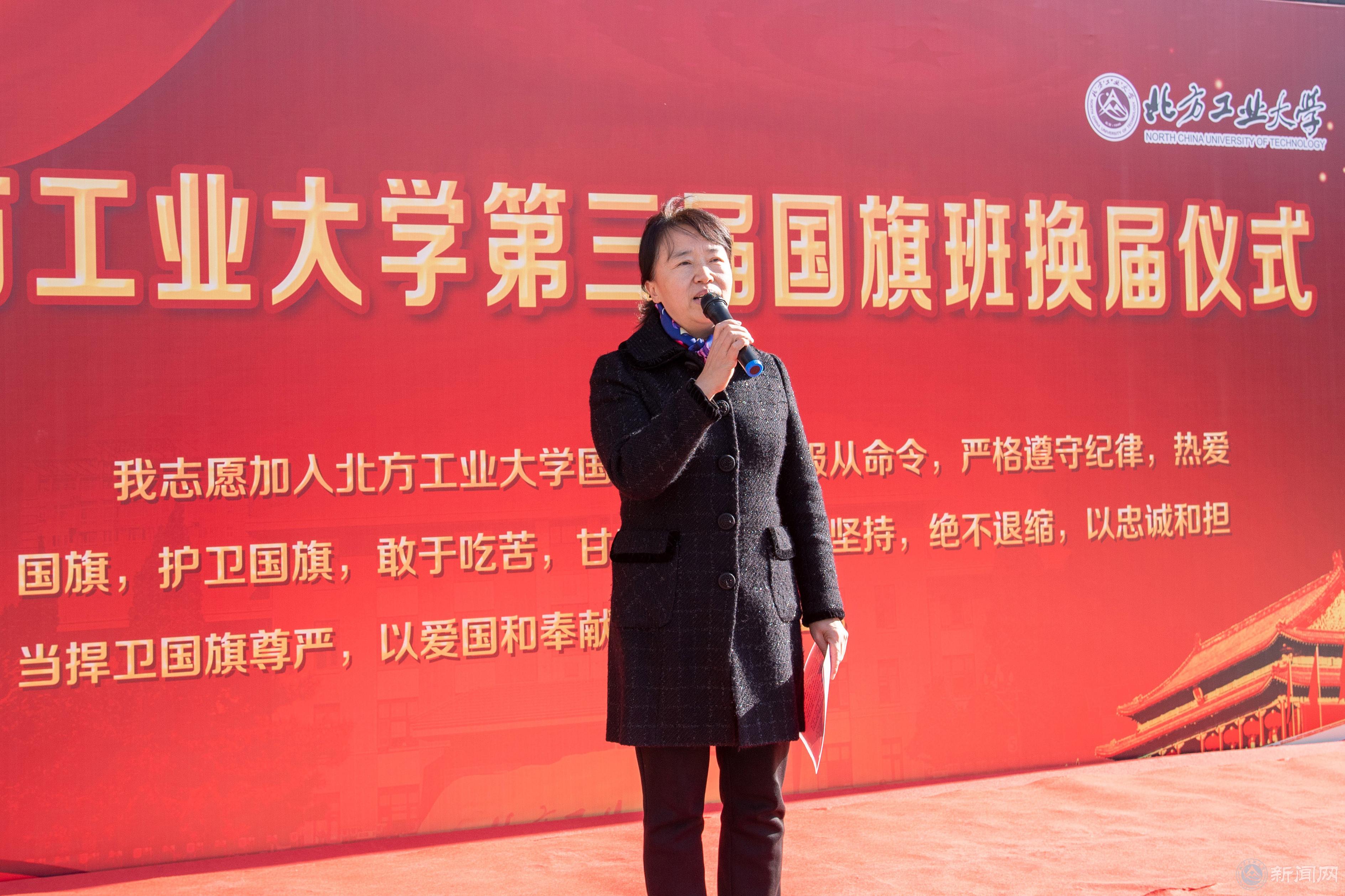 田紅芳副書記在儀式上講話。她指出,國(guó)旗班隊(duì)員是北方工大校園里離國(guó)旗最近的人,隊(duì)員們迎酷暑、斗嚴(yán)寒,以崇高的愛國(guó)熱情、吃苦耐勞的精神、嚴(yán)于律己的品質(zhì)贏得了校內(nèi)師生的一致好評(píng)。升國(guó)旗活動(dòng)已成為我校愛國(guó)主義教育、集體主義教育、革命主義教育的重要載體。愛國(guó)主義是中華民族最重要的精神財(cái)富,她希望新一屆國(guó)旗班成員再接再厲,牢記使命、勇于擔(dān)當(dāng)、踐行責(zé)任、刻苦訓(xùn)練,將“愛國(guó)、愛旗、愛校”精神融入日常學(xué)習(xí)生活中,用實(shí)際行動(dòng)感染身邊的同學(xué),涵養(yǎng)校園文化。她強(qiáng)調(diào),全體北方工大師生都要有一顆愛國(guó)、報(bào)國(guó)的心,廣大師生要將愛國(guó)和愛黨、愛社會(huì)主義有機(jī)統(tǒng)一起來(lái)。讓愛國(guó)主義精神成為每名北方工大人的堅(jiān)定信念和精神依靠。