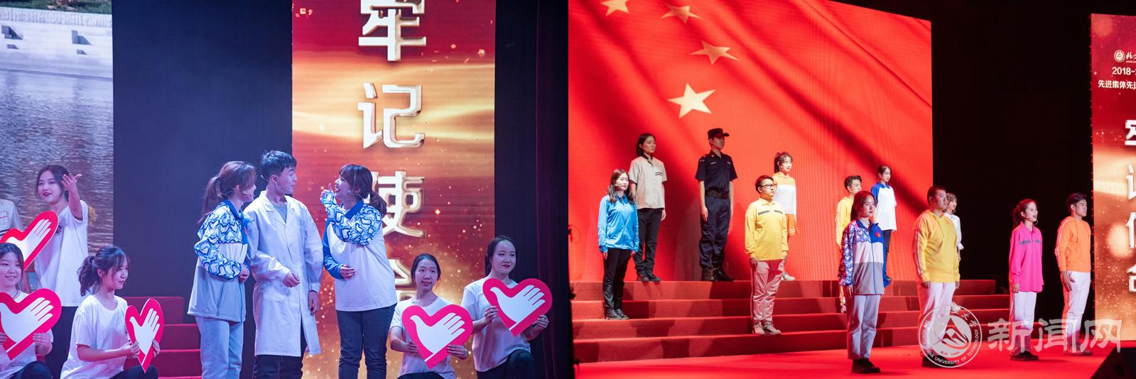 頒獎典禮在《我和我的祖國》的悠揚旋律中拉開序幕。《祖國有我》《我為祖國》《歌唱祖國》三幕舞臺劇,融合舞蹈、合唱等藝術表演形式,生動再現了我校三千余名師生團結一心、全力投入服務保障國慶70周年慶祝活動的感人故事,展現了我校師生用青春報效祖國,用行動服務國家的決心和姿態。劇中主角們講述了自己在群眾游行、群眾聯歡、志愿者及后勤保障工作中的收獲與成長。親歷盛世華誕,將青春身影留在天安門廣場上的迫切愿望使每名同學獲得了強大的精神動力,同學們抱定決心、團結一致、克服困難、追求訓練極致的奮斗精神讓觀眾們動容。