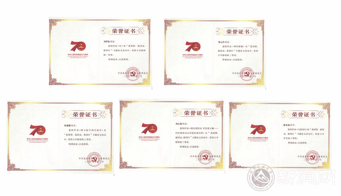 在喜迎新中國成立70周年的慶祝活動中,北方工大師生拿起手中的筆,通過撰寫文章的形式,講述身邊的奮斗故事,禮贊新中國的偉大成就,并積極參與市委教育工委主辦的“愛國情、強國志、報國行”主題征文活動,取得了良好的成績。