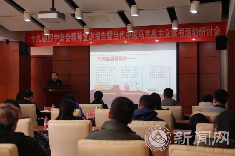 在宣講環節,馬克思主義學院院長張加才以《中華民族偉大復興的制度保障》為題,做了一次解讀黨的十九屆四中全會精神的輔導報告,正式拉開了讀書活動的序幕。