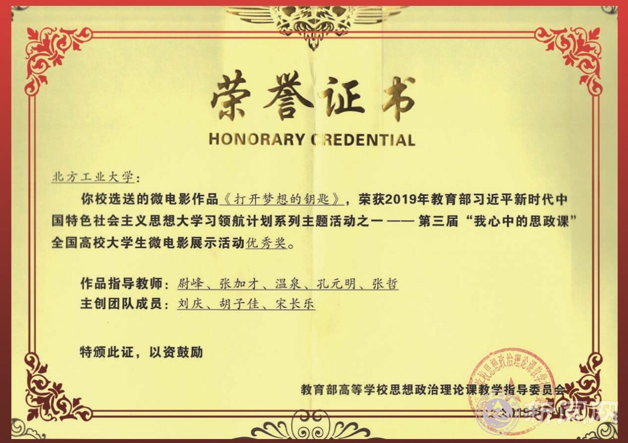 近日,由教育部高校思政課教學指導委員會主辦的第三屆“我心中的思政課”全國高校大學生微電影展示活動公布獲獎名單,由我校宣傳部、馬克思主義學院共同指導拍攝的微電影作品《打開夢想的鑰匙》獲全國優秀獎。該作品此前進入北京市高校前十名,代表北京參加全國評選。