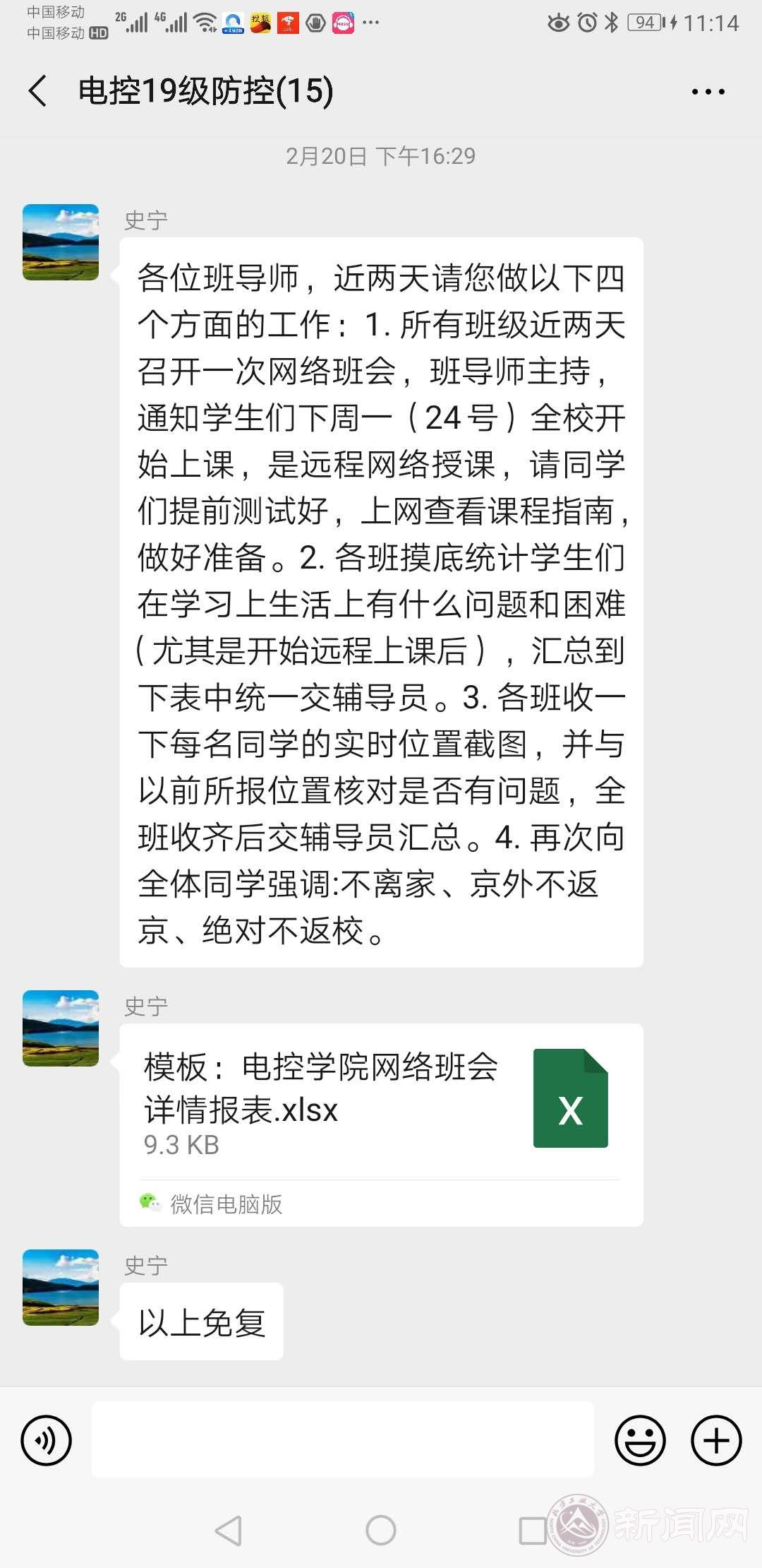 同時,學院還要求研究生導師、班導師、輔導員對新學期在線教學和畢業設計等進行安排,進一步落實相關要求。一是各班級召開一次網絡班會,由班導師主持,逐一通知學生2月24日學校開始遠程網絡授課,提前和學生一起進行測試,做好軟硬件和技術準備。二是梳理匯總學生在線學習中遇到的問題與困難。學院設計了《電控學院網絡班會詳情報表》,收集匯總同學們在在線課堂、選課、補考、畢業設計、就業、考研等各方面的問題,尤其是開始遠程上課后,建立教學答疑群,第一時間回復學生。三是繼續實時精準掌握學生情況。排查班級每位學生,核對每名同學的實時位置,全面準確掌握學生動態,再次向全體同學強調 “不離家、不返校、在家學習” 。