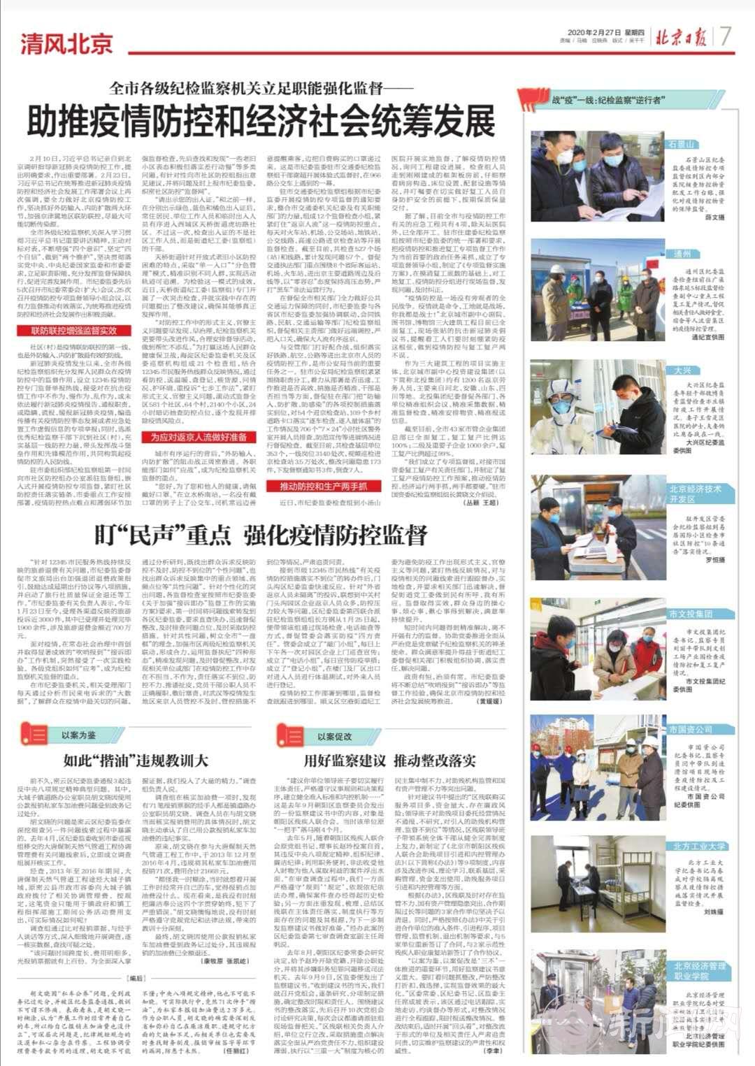 2月27日,《北京日?qǐng)?bào)》刊登我校紀(jì)委書記馬春成在學(xué)校隔離觀察點(diǎn)對(duì)疫情防控措施落實(shí)情況開(kāi)展監(jiān)督檢查的照片。同一天,市紀(jì)委官方網(wǎng)站“北京紀(jì)檢監(jiān)察網(wǎng)”及微信平臺(tái)“清風(fēng)北京”推送了“北京多級(jí)聯(lián)動(dòng)監(jiān)督,筑牢高校安全屏障”的消息,介紹了我校紀(jì)委監(jiān)督檢查校內(nèi)家屬區(qū)疫情防控工作的情況。目前,這兩條報(bào)道均被推薦至“今日頭條”、“學(xué)習(xí)強(qiáng)國(guó)”平臺(tái)。學(xué)校紀(jì)委不僅代表高校,也作為北京紀(jì)檢工作的典型受到了廣泛關(guān)注,展現(xiàn)了我校疫情防控專項(xiàng)監(jiān)督工作的良好風(fēng)貌。