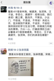 以宿舍為單位開(kāi)展微信朋友圈公開(kāi)承諾傳遞,如悅齋704宿舍馬若楠、李雨澄、董玉娜,王星宇:疫情當(dāng)前,我們承諾!戴口罩,勤洗手,不聚會(huì),少出門(mén),不信謠,不造謠,不傳謠!未經(jīng)允許,堅(jiān)決做到不離家、不返京、不返校!保持良好的學(xué)習(xí)生活習(xí)慣,積極做力所能及的事情。萬(wàn)眾一心,打贏疫情防衛(wèi)戰(zhàn)!@悅齋705宿舍你們的承諾在哪里?據(jù)悉,2019級(jí)100多個(gè)學(xué)生宿舍全部參與線上公開(kāi)承諾活動(dòng)。