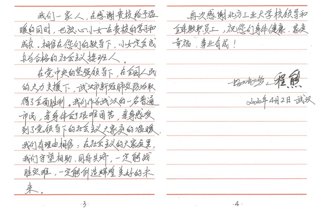 “小女程煜洋是貴校大二學生。我們一家生活在湖北省武漢市。我和我的夫人,想通過這封信,對您們表達真誠的感謝和崇高的敬意。在2020年史無前例的新冠肺炎抗疫期間,程煜洋陸續收到了貴校的慰問金、口罩、通信費等現金和物資,讓我們身處抗疫中心的一家人倍感溫暖,深切感到校方的關愛和情義……”。這是4月3日信息學院輔導員楊和家收到的一封來自通信18-3班程煜洋同學家長的感謝信,全文600余字,飽含了身處武漢抗疫中心的一家人對學校學院在疫情期間給予關心關愛的深切感激之情。