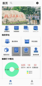 教師端,開發(fā)了“智慧學工”APP。信息學院“智慧學工”APP在準確收集信息同時,還可將每日學生信息進行實時大數(shù)據(jù)分析,對學生跨省位置變化、身體狀況異常、出行計劃報備、未打卡狀況等進行自動化處理和可視化顯示,并實時在“智慧學工”APP中通知班導師、輔導員和學院,真正做到聯(lián)防聯(lián)控、科學防控。“智慧學工”APP能夠幫助輔導員、班導師進行在線“深度輔導”記錄共享,從專業(yè)、班級、宿舍和學生個人四個層次搭建詳細的學生電子臺賬,針對各類問題建立不同關(guān)注群體,分類施策、隨時輔導。