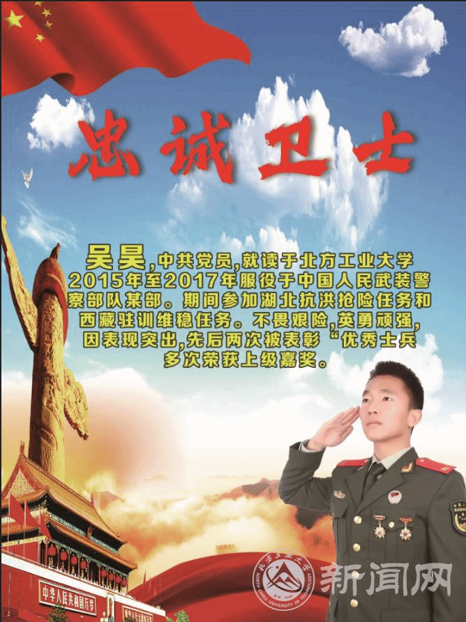 吳昊同學是從64所高校推薦的80名在校退役大學生士兵選拔而出的30名優秀代表之一。歷經市校兩級視頻評選、資格審核、述優答辯、專家評審等環節脫穎而出。吳昊同學在服役期間參加過湖北抗洪搶險、西藏駐訓維穩等任務,因不畏艱險,英雄頑強,先后兩次被評為“優秀士兵”,多次榮獲上級嘉獎。退役復學后,堅持將在軍隊里養成的好作風、好習慣帶到日常學習中,學習刻苦認真,積極參加國慶70周年慶祝活動。先后獲得校級一、二等學習獎學金,“國慶 70 周年游行活動”優秀教官、北方工業大學優秀隊長等榮譽。