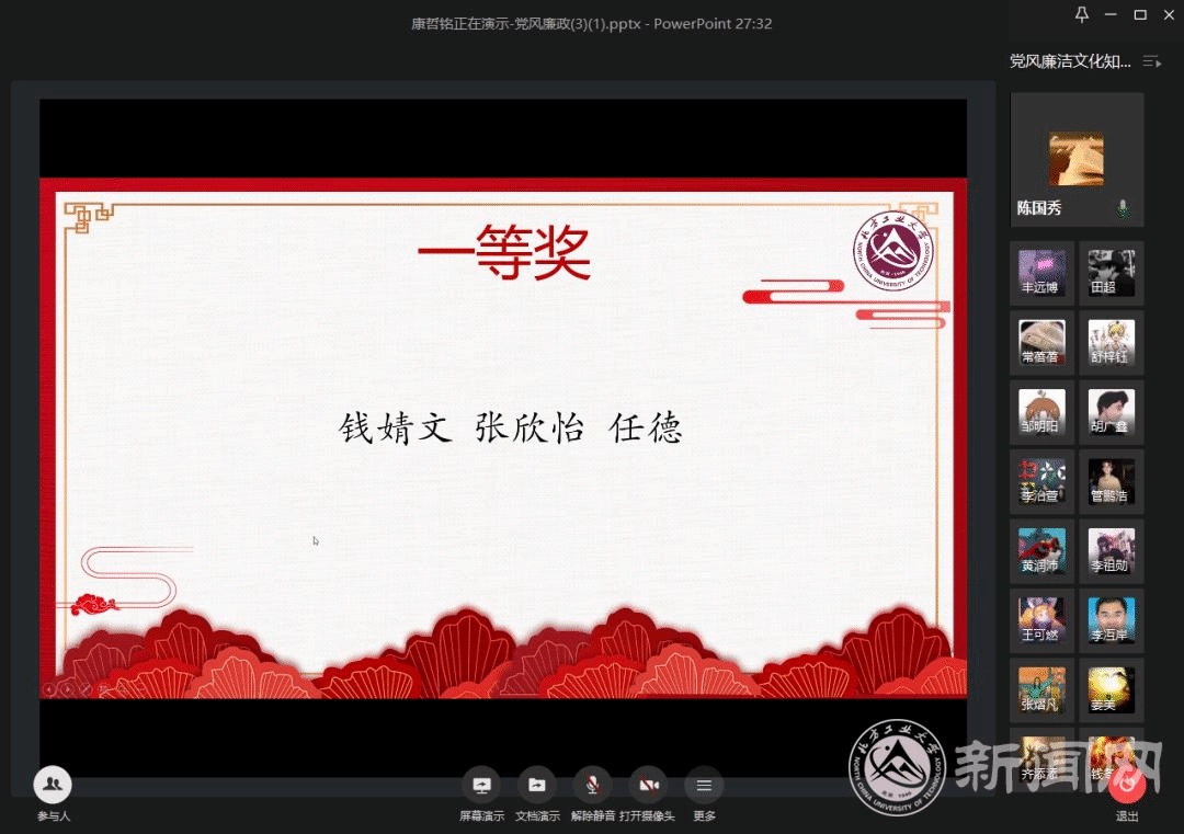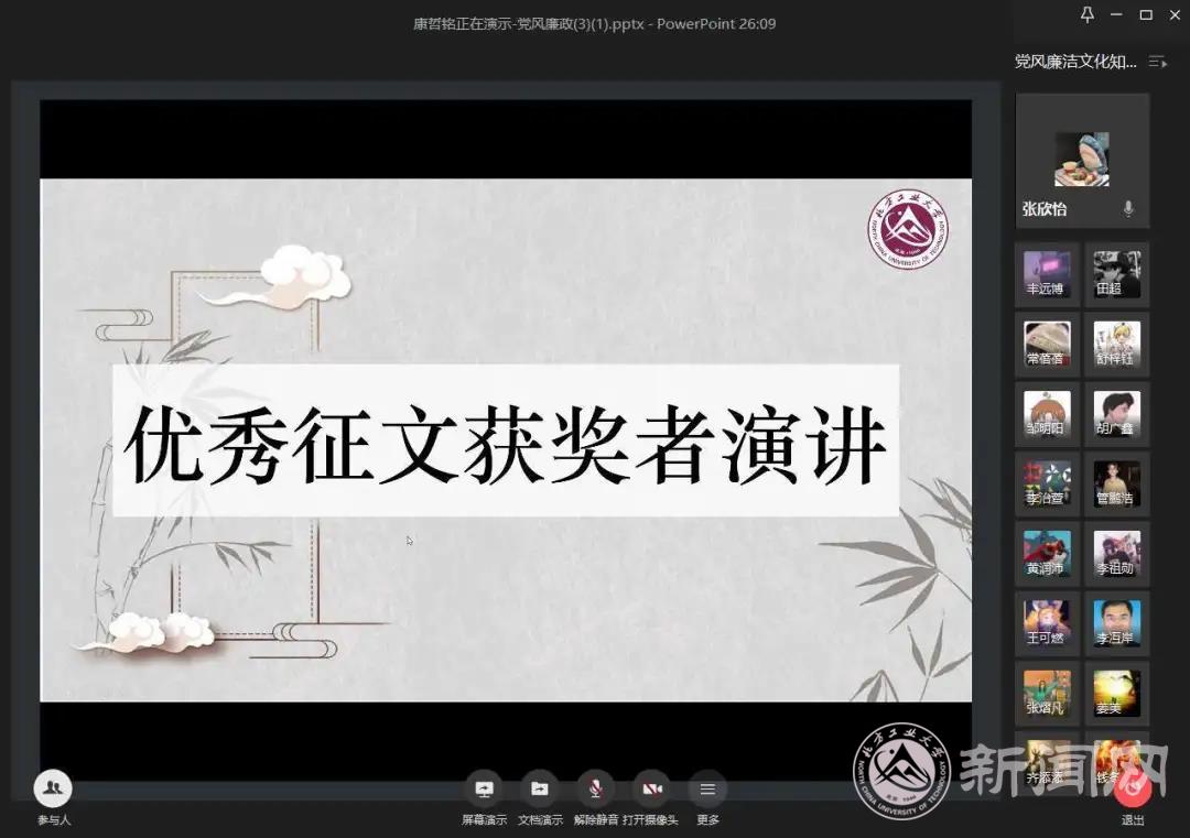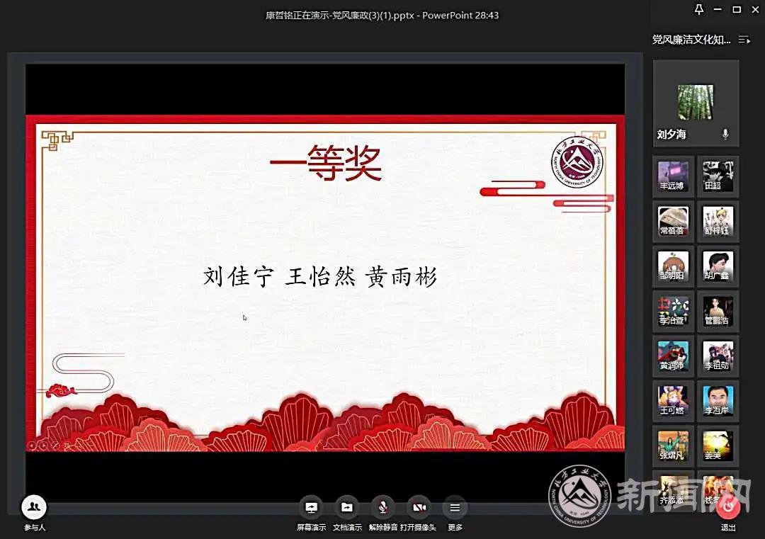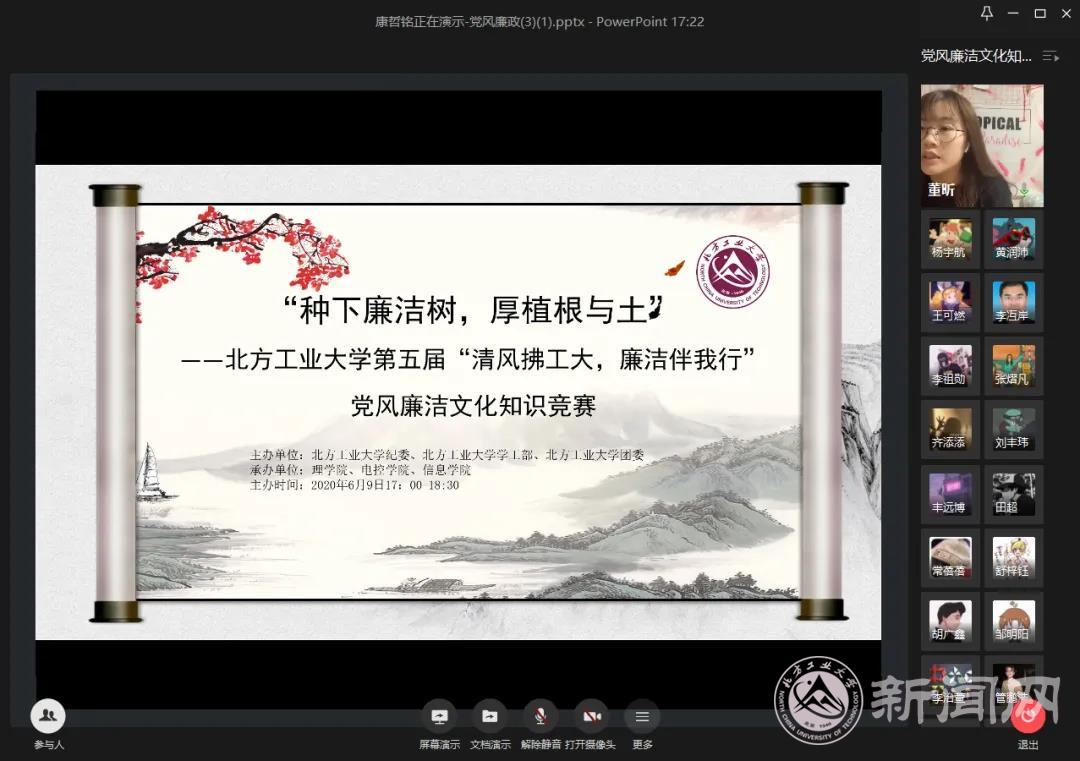 6月9日下午,由校紀(jì)委、校學(xué)工部、校團(tuán)委主辦,信息學(xué)院黨委、電氣與控制工程學(xué)院黨委、理學(xué)院黨委聯(lián)合承辦的“種下廉潔樹(shù),厚植根與土”——北方工業(yè)大學(xué)第五屆“清風(fēng)拂工大,廉潔伴我行”黨風(fēng)廉政文化知識(shí)競(jìng)賽暨在線頒獎(jiǎng)儀式隆重舉行。校紀(jì)委、學(xué)工部、校團(tuán)委、各學(xué)院負(fù)責(zé)人及部分師生參加了頒獎(jiǎng)儀式,并參與了網(wǎng)上踐諾簽名活動(dòng)。