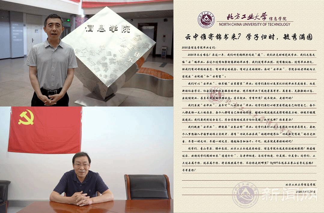 馬禮院長、劉文楷書記分別致辭,他們在講話中回顧2020屆畢業生取得的優異成績,祝賀同學順利畢業,并勉勵同學通過自己的奮斗,獲取幸福人生,以專業技能,建設偉大祖國,同時表示北方工大信息學院是畢業生永遠的家,疫情退卻之后,歡迎大家經常回家看看。學院對全體2020屆畢業生“寄送”云錦書,送上祝福與期望。