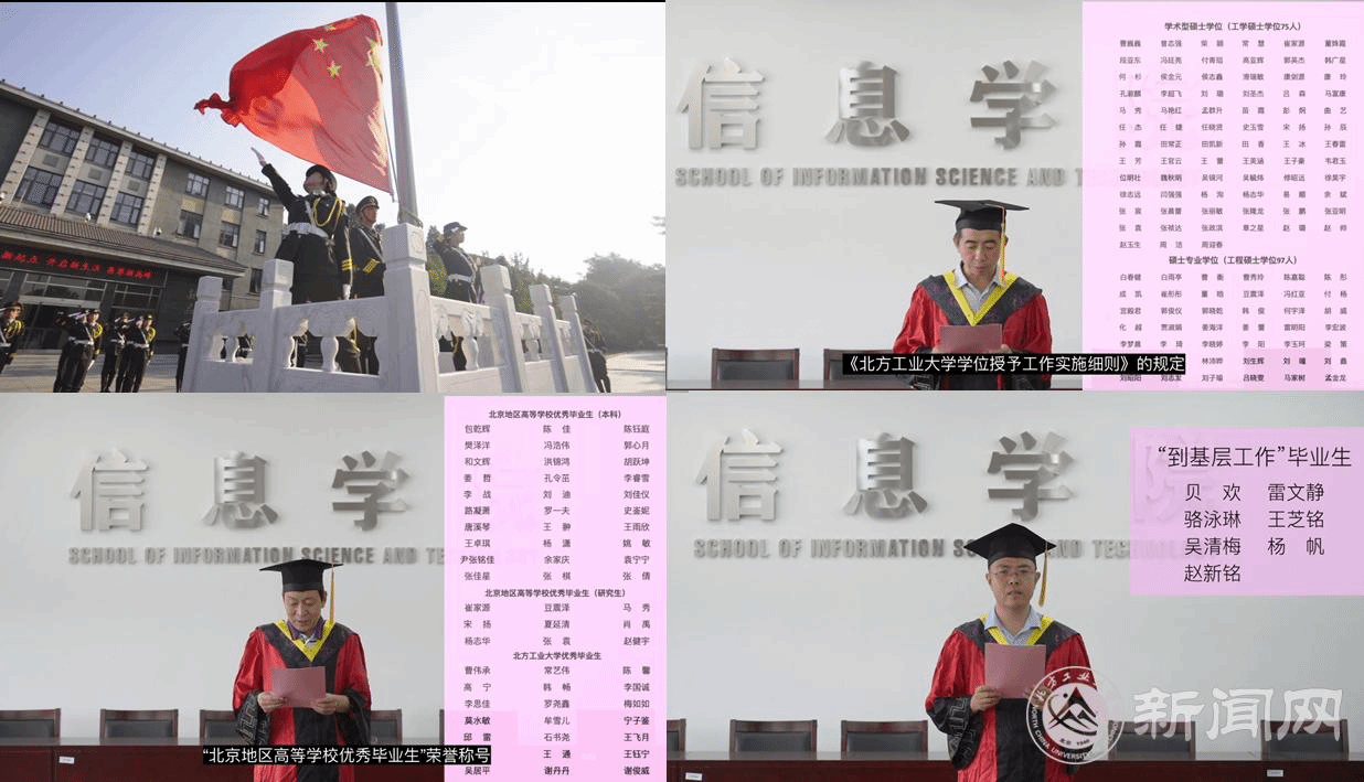 伴隨著莊嚴的國歌和國旗班升旗視頻,典禮正式開始。信息學院院長馬禮教授宣讀《北方工業大學學位授予決議》,信息學院2020屆共有畢業生近787人,762名同學獲得學位,其中184人獲碩士學位,578人工學學士學位。學院黨委書記劉文楷教授宣讀《2020屆優秀畢業生表彰決定》,學院共有39名本科生、研究生獲評“北京地區高等學校優秀畢業生”榮譽稱號,另有30名本科生獲評“北方工業大學優秀畢業生”榮譽稱號。副院長宋威教授宣讀《2020屆“到基層工作”畢業生表彰決定》,學院共有7名畢業生赴基層工作。