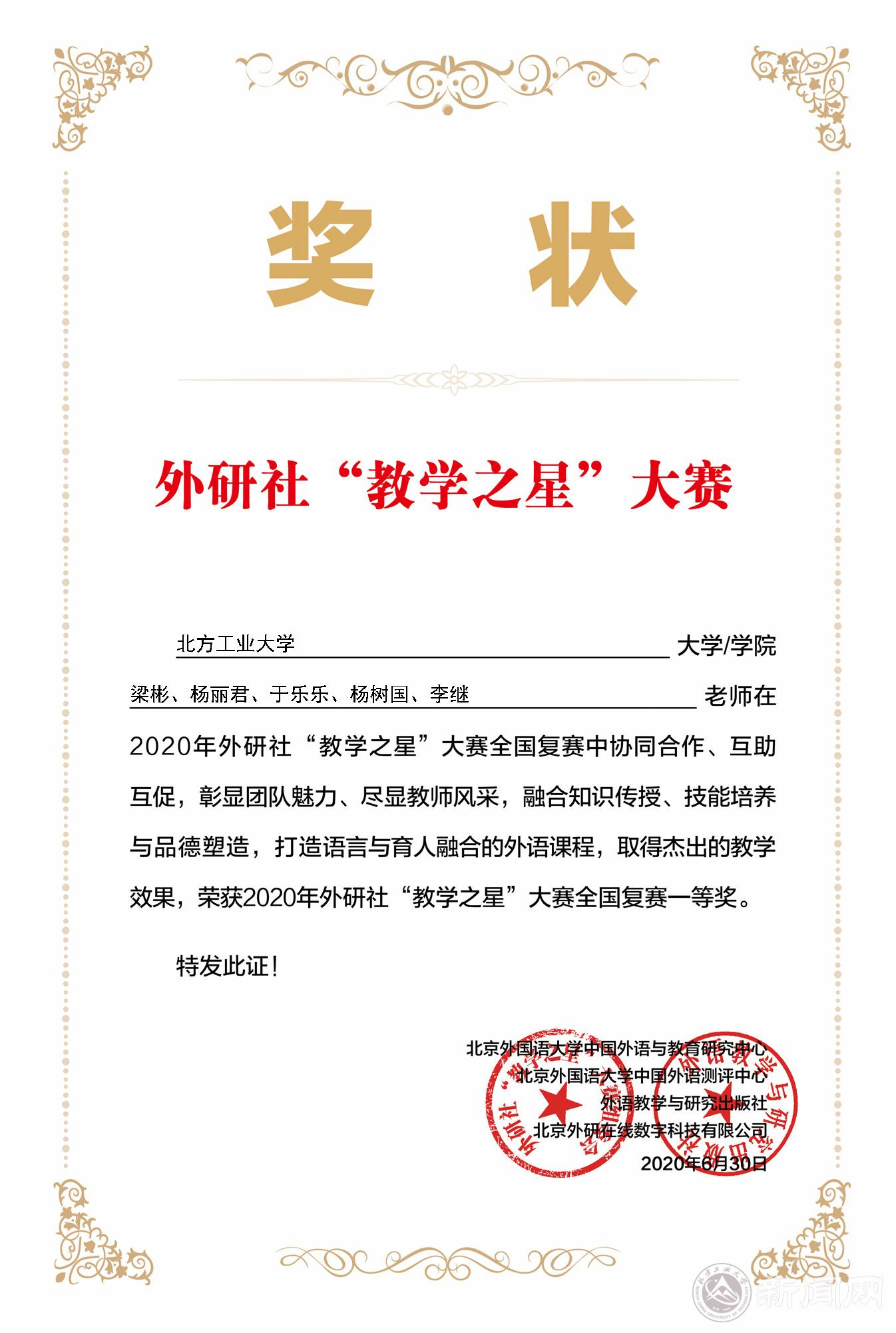 近日,2020年全國外研社“教學之星”大賽復賽獲獎名單出爐,由我校文法學院公共英語系梁彬、楊麗君、于樂樂、楊樹國、李繼等五位教師組成的教學團隊代表學校參賽。經過激烈角逐,該團隊從來自全國的406組大學英語教學團隊中脫穎而出,獲得一等獎的優異成績。